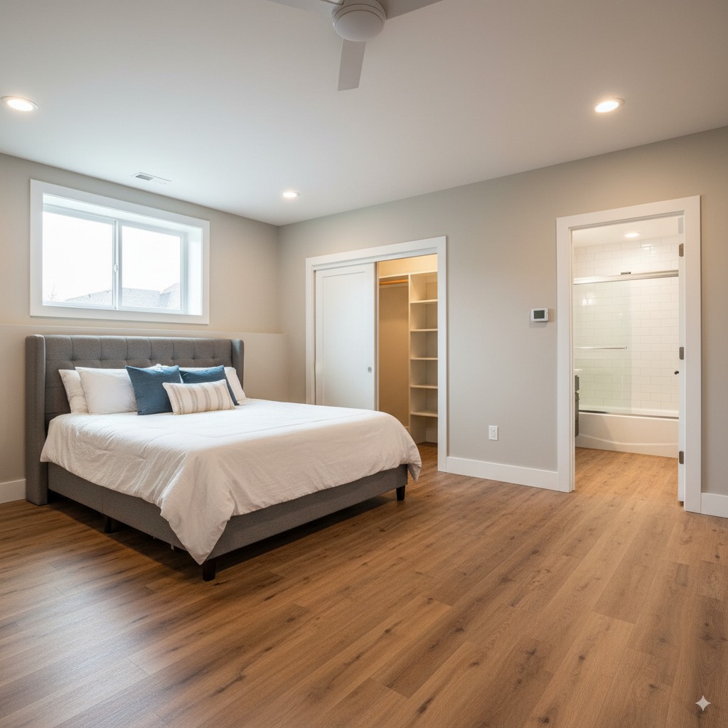 A comfortable guest suite with private bathroom, egress window, and custom lighting fixtures.